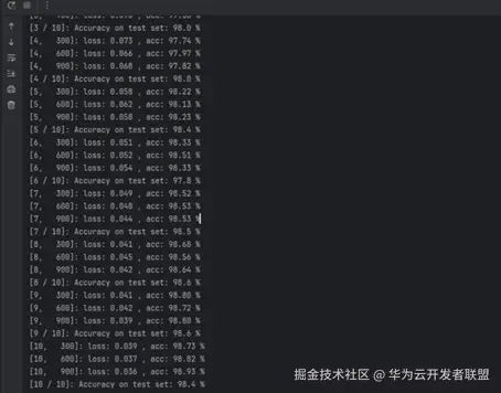 运行结果中有loss损失函数,以及acc准确率,可以看到loss损失函数在慢慢的降低,而acc准确率在慢慢的升高。acc准确率提高的原因是因为训练轮数的不断增加,交叉熵损失衡量了模型预测与真实标签之间的差异。在训练过程中,优化器的目标是使损失函数最小化。随着训练轮数的增加,损失函数的值逐渐降低,这意味着模型的预测越来越接近真实标签,从而提高准确率。