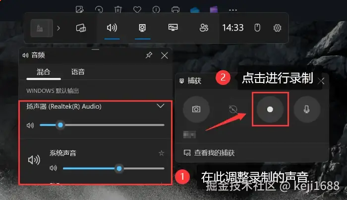 步骤2:在Xbox Game Bar中选择 【录制】 选项,调整录制声音后进行录制。