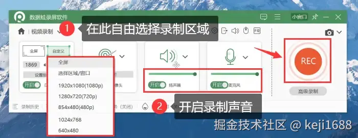 步骤2:选择 【视频录制】 模式进入,在录制开始前可以根据录制内容自由选择录制区域并调整录制的声音等。然后点击 【REC】 按钮开始录制。