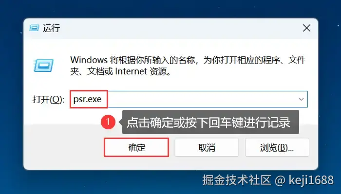 步骤1:按 【Win+R】 组合键,打开 【运行】 对话框,输入 【psr.exe】 并按下 【确定】 键启动步骤记录器。