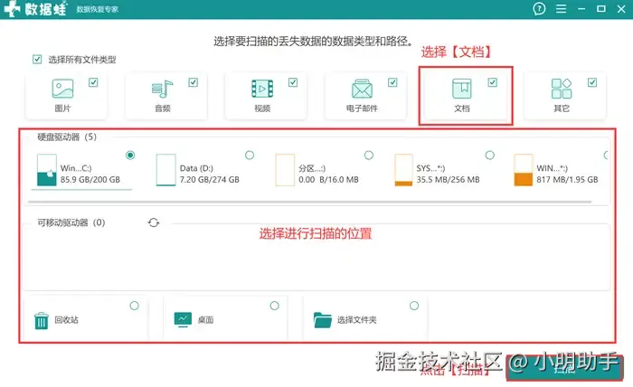 步骤1: 打开软件,选好文档作为扫描的文件类型,再选择文档数据丢失的位置,然后操作软件开始扫描;