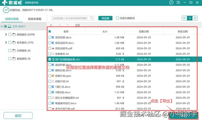 步骤2: 扫描结束后选择自己需要恢复的文件,然后点击【导出】;