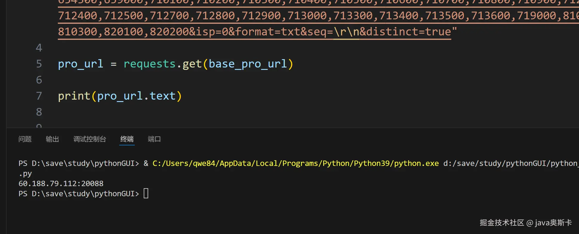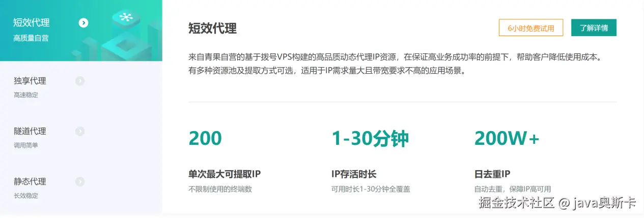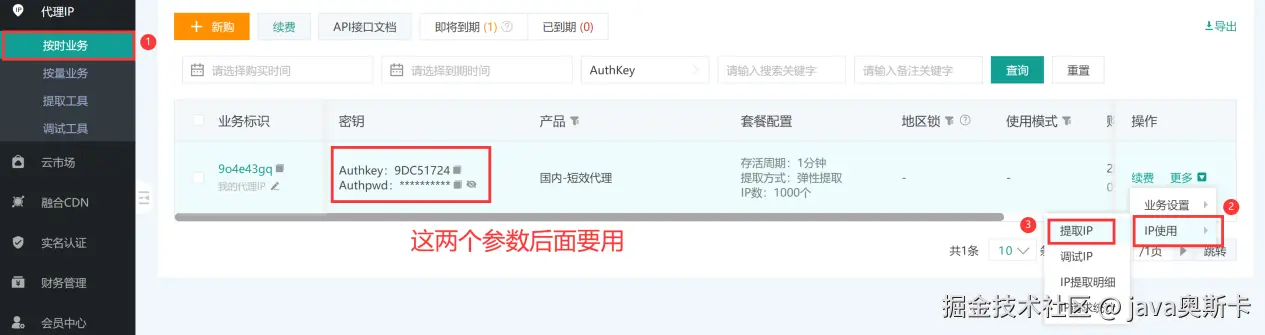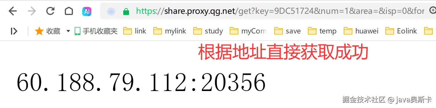 有了连接后我们直接来获取对应的IP与端口号,这个就是我们要使用的地址,我用的是短效的,所以有效期60秒,但是做请求是够了的,并且有贴心的6小时免费,我们用作测试刚刚好。