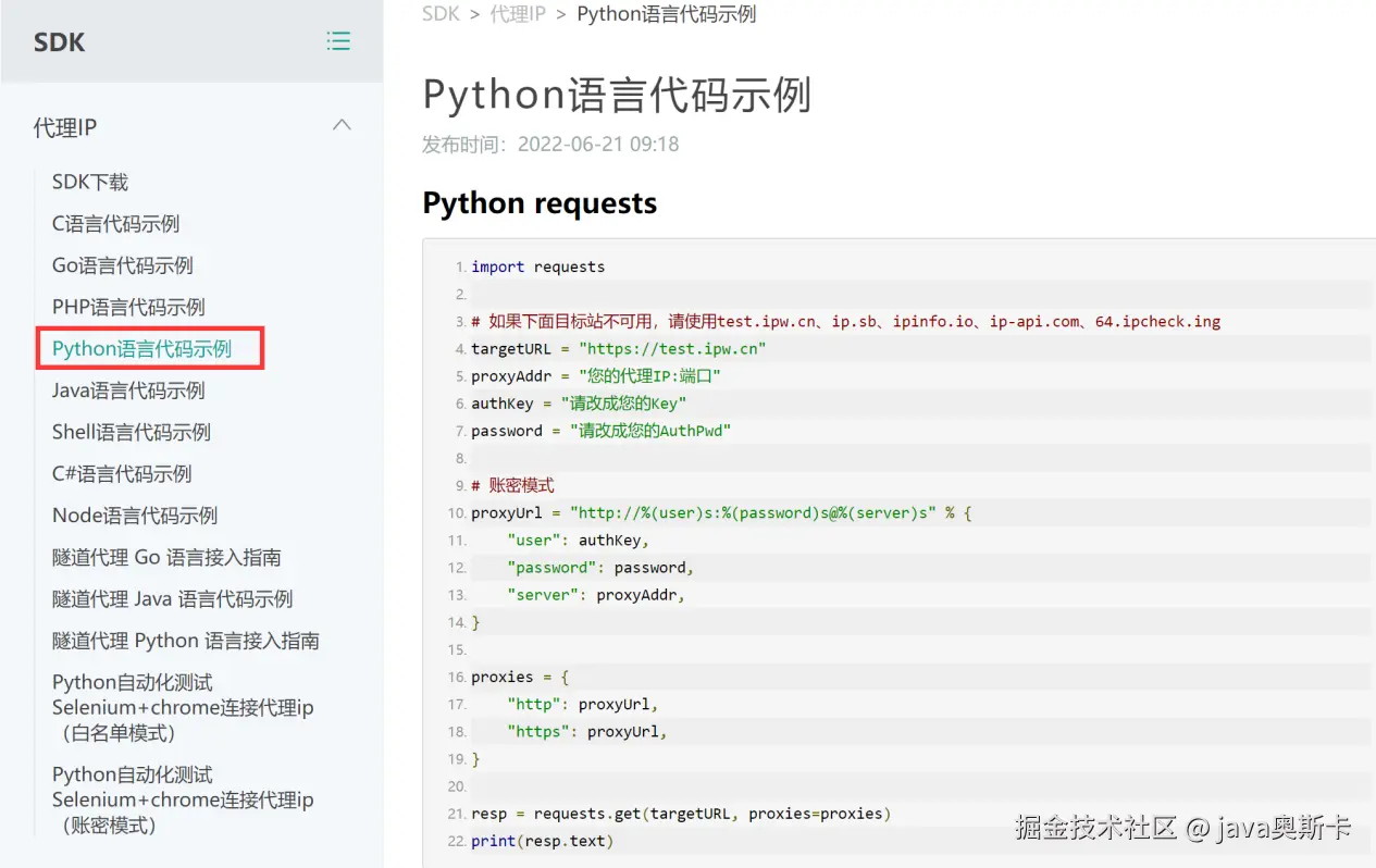 | Python import requests import json base_pro_url = "替换你的地址" pro_url = requests.get(base_pro_url) targetURL = "替换你的目标地址" proxyAddr = pro_url.text.replace("\r\n", "") authKey = "9DC51724" password = "C35577FEEF22" print(proxyAddr) # 账密模式 proxyUrl = "http://%(user)s:%(password)s@%(server)s" % { "user": authKey, "password": password, "server": proxyAddr, } proxies = { "http": proxyUrl, "https": proxyUrl, } http = requests.post(targetURL, proxies=proxies) result = json.loads(http.text) for i in range(len(result["result"]["resultList"])): print("排行"+str(i+1)+result["result"]["resultList"][i]["bookName"]) |