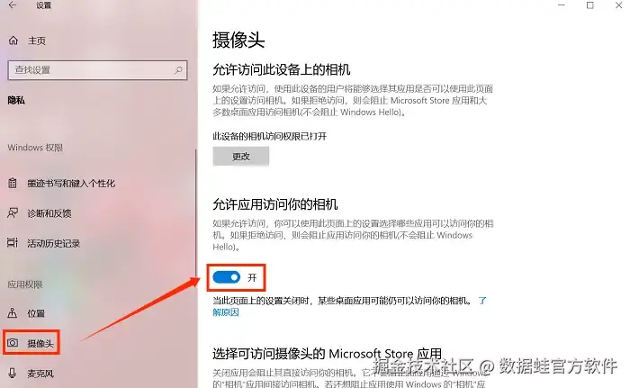 步骤2: 找到并点击 【隐私】 选项。接着,在左侧菜单中点击 【摄像头】 ,确保摄像头功能处于开启状态。