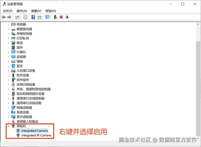 步骤2: 找到 【摄像头】 选项,点击进行检查。如果摄像头处于禁用状态,右键单击摄像头设备,选择 【启用】 即可。