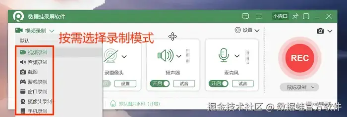 电脑免费录屏软件哪个好?接下来给大家分享的是我们今天的重头戏——数据 蛙录屏软件。它是一款功能强大、操作简便的电脑免费录屏软件。软件支持视频、窗口、摄像头等多种录制模式,还能录制游戏画面,满足你的各种需求。
