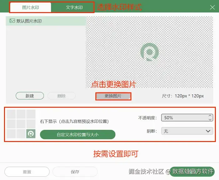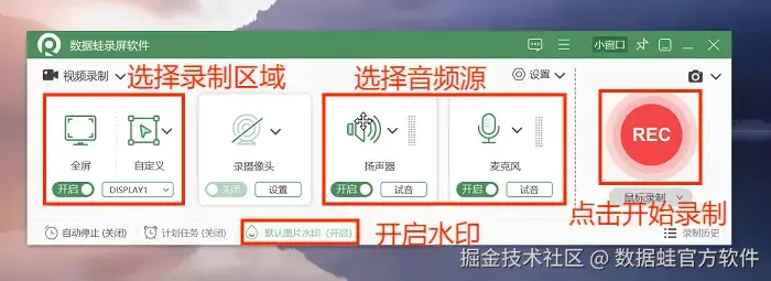 步骤2: 接着选择需要录制的区域和音频源,如果想给视频增加水印,还可以进入水印设置界面,调整水印图片、水印大小等参数。设置完毕后,点击 “REC” 按钮开始录制视频。