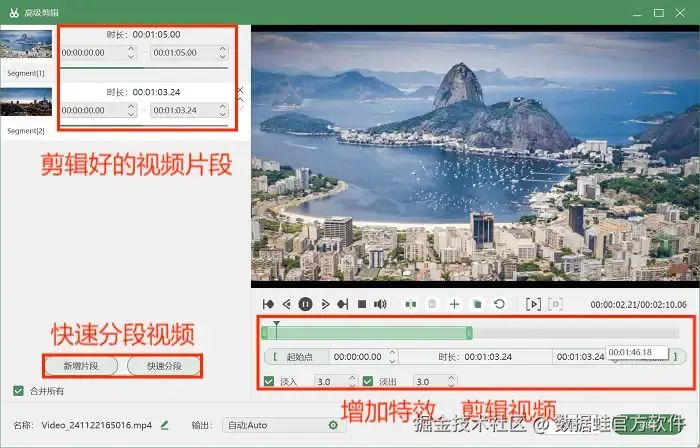 步骤3: 录制完成后点击“停止” 按钮,预览窗口就会自动弹出,我们可以在预览窗口中查看视频,也可以选择 “高级剪辑” 工具对视频进行后期编辑操作,如快速分段视频、增加视频特效等。