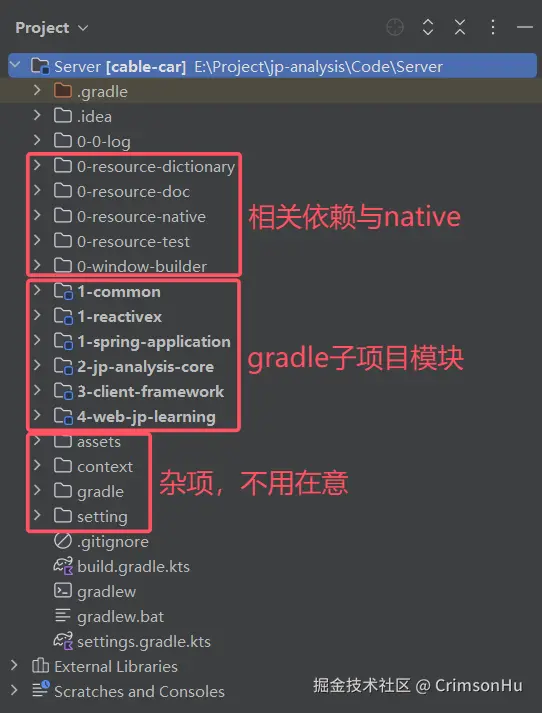 如图,项目结构其实很简单。虽然文件夹很多,但是真正只用关心的是中间的 gradle 子项目模块、 build.gradle.kts 、 settings.gradle.kts 这三个地方。