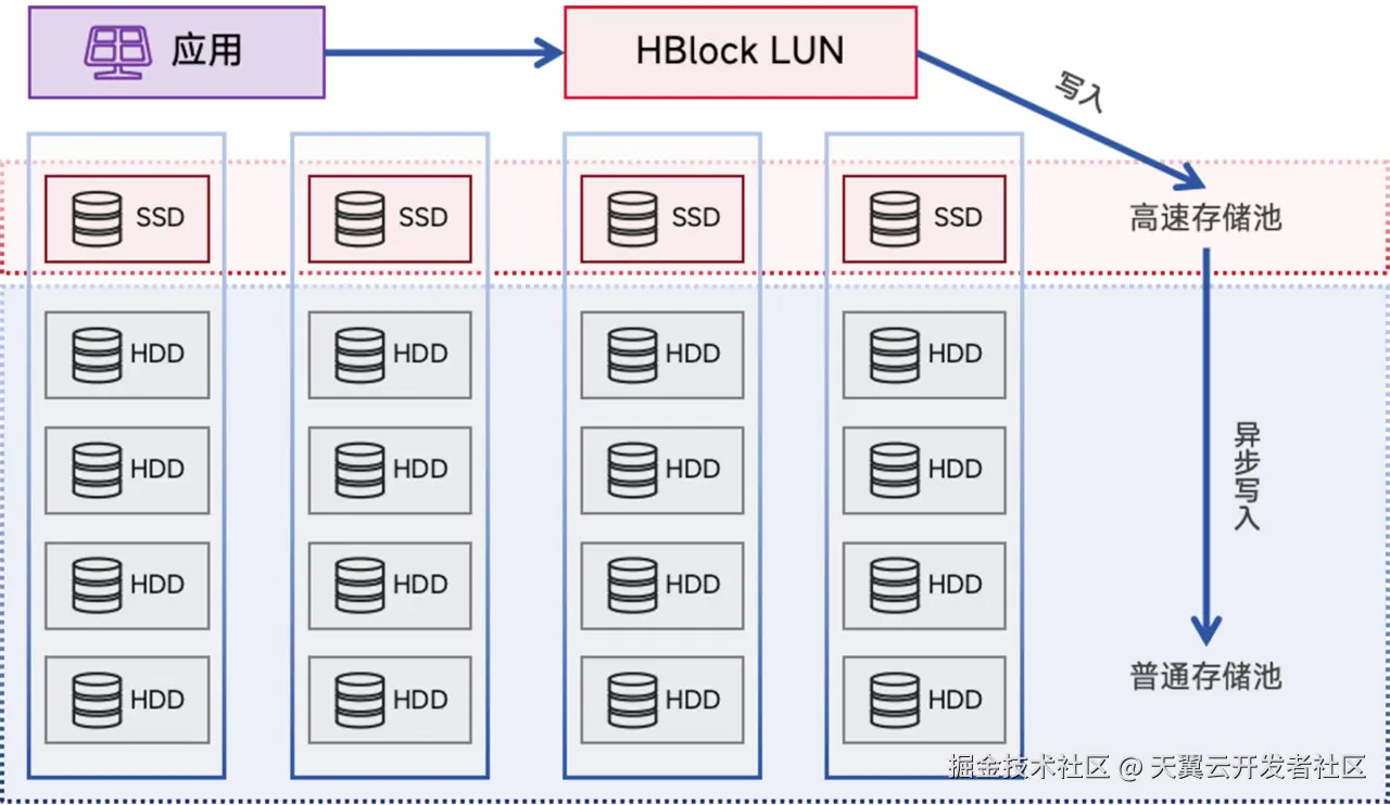 HBlock的多存储池机制,可将通用服务器性能提升到极限,卷读写时可将数据先写入SSD组成的高速缓存池中,最终无感存入普通硬盘组成的普通存储池中。在用户有少量SSD和大量HDD资源的场景下,可以为用户提供SSD的写入体验和HDD的存储规模。