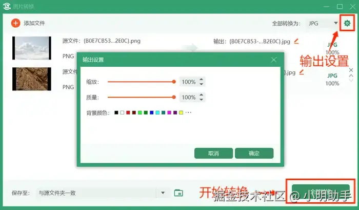 第四步: 还可以点击右上角的绿色齿轮按钮,进行【背景颜色】、【缩放】等输出设置。完成所有设置后,点击右下角的【全部转换】开始转换输出格式。