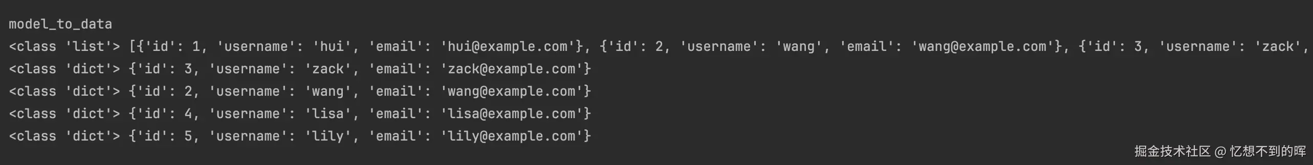 model_to_data:将各种模型对象(SQLAlchemy、Pydantic、Dataclass 等)还原为原始数据(字典或列表)。