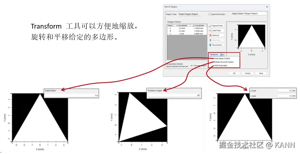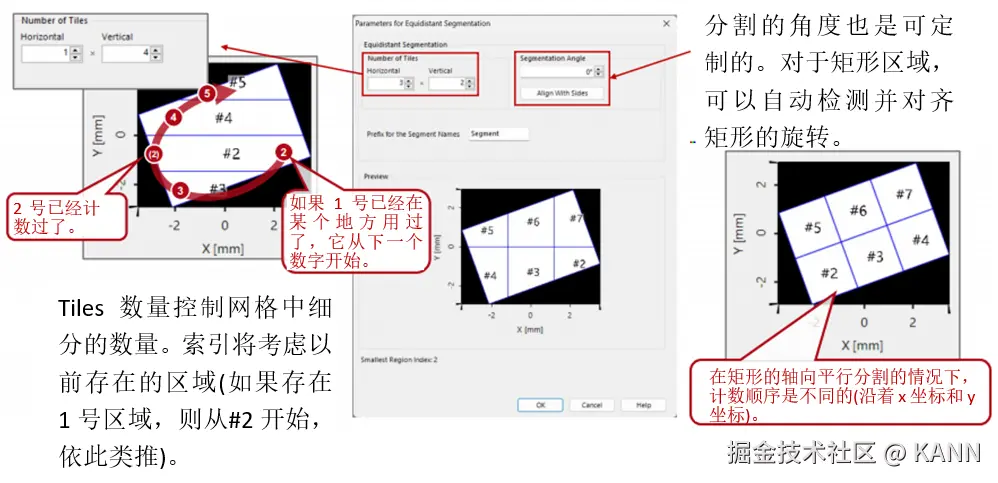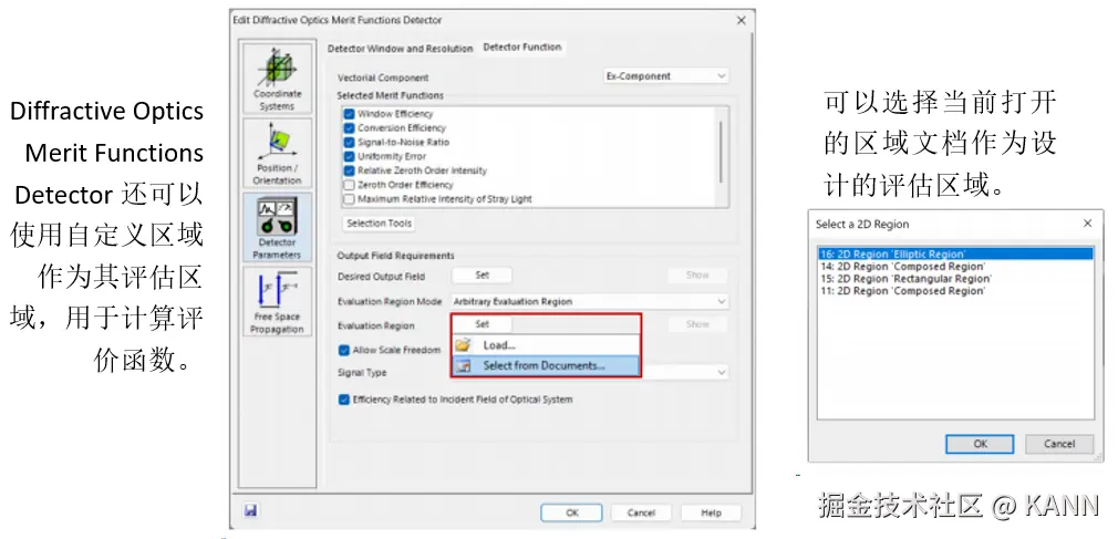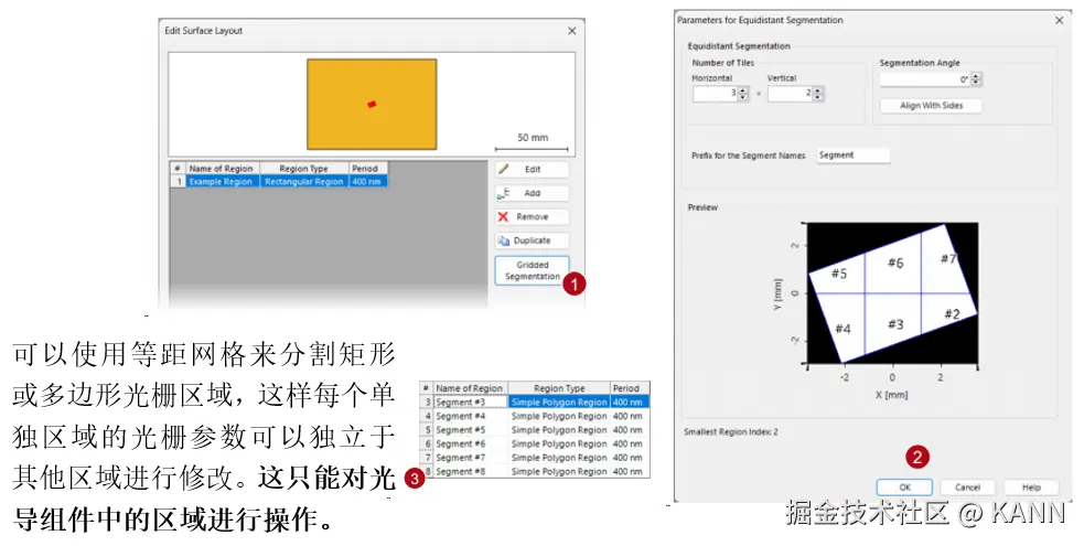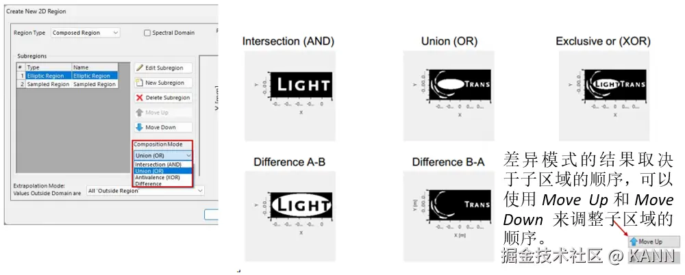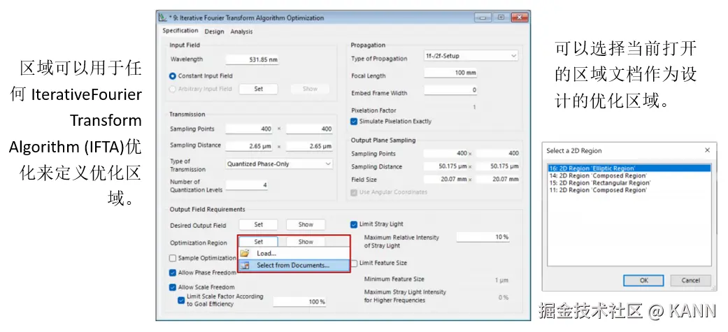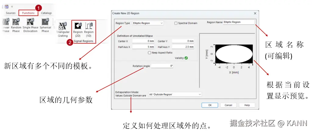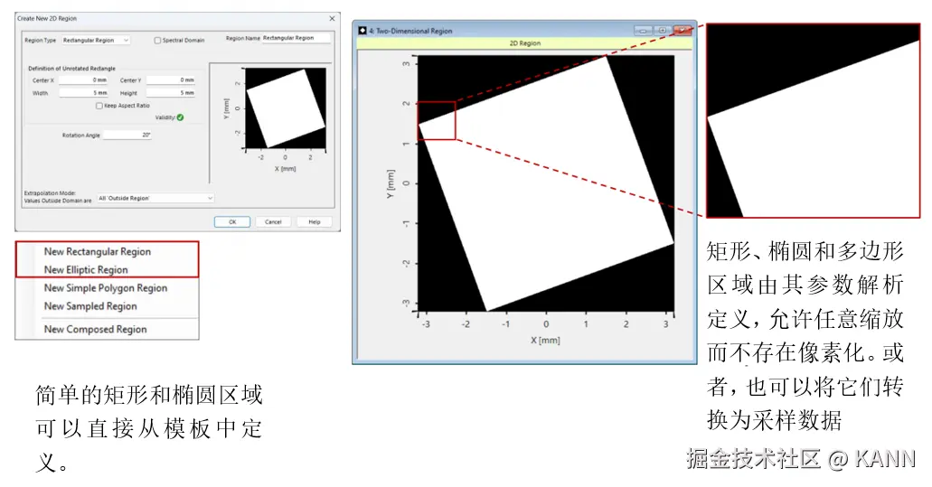 摘要 在VirtualLab Fusion中,“区域”的概念(被理解为在平面上定义的有限区域,有时也是1D)在整个软件中用于多个目的:确定IFTA所需的优化区域或Diffractive Optics Merit Functions检测器的评估区域,但也定义光导表面上的光栅区域以执行功能,例如耦合器。为了在不限制用户的情况下涵盖上述所有内容,VirtualLab Fusion中的区域配置非常灵活,具有几个现成的选项以及导入功能。在这个用例中,我们将详细介绍区域配置的过程。 区域定义 注意:在Light Guide组件中,可以直接在组件本身中生成和配置区域。 简单的区域 简单区域旋转 简单的矩形和椭圆区域可以旋转到任何所需的角度(在平面上)。 多边形区域 多边形区域变换 采样区域 组合区域 可以使用组合区域类型生成更复杂的形状,如甜甜圈或棋盘区域,该类型使用逻辑运算符组合多个单独的区域。 使用不同逻辑运算符组合区域 我们演示了不同的运算符对(解析定义的)椭圆和代表LightTrans标志的采样区域的组合的影响: 用作优化区域 用作评估区域 用于光导组件 分段网格(仅光导光学设置) 网格分割-选项  | |