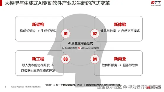 第一点是认知和思想方面的变化,称为AI First新思想,即在软件开发或业务活动中遇到任何问题,首先会思考如何用大模型和生成式AI的技术来解决,这是一种新的思维方式,既包括了对技术的认知,也包括了如何用技术来重构既有的业务流程,或者颠覆既有的开发模式。