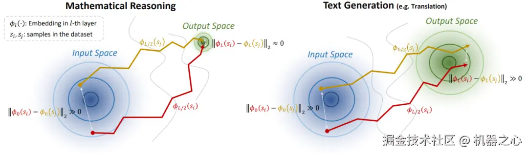 在数学推理场景下,输出空间具有显著的高密度模式坍缩特征,这使得在输入空间相差较大的两个起始点,通过隐藏层转移至输出空间后,将收敛到非常近的距离。这个 “终点收敛” 现象将增大不同样本的 Embedding 轨迹之间产生差异的可能性,如下图所示。该理论分析的数学建模和证明详见论文。