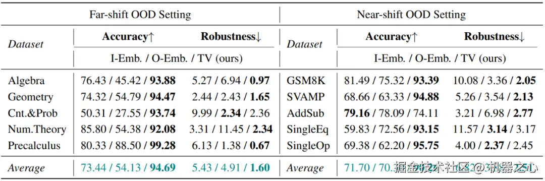 研究团队使用了 11 个数学推理数据集(其中 1 个 ID 数据集和 10 个 OOD 数据集)在两个不同规模的语言模型(Llama2-7B 和 GPT2-XL)上进行了实验。根据和 ID 数据集之间的难度差异大小,这 10 个 OOD 数据集被分为两组,分别代表 Far-shift OOD 和 Near-shift OOD。实验在离线检测和在线检测这两个场景下进行: