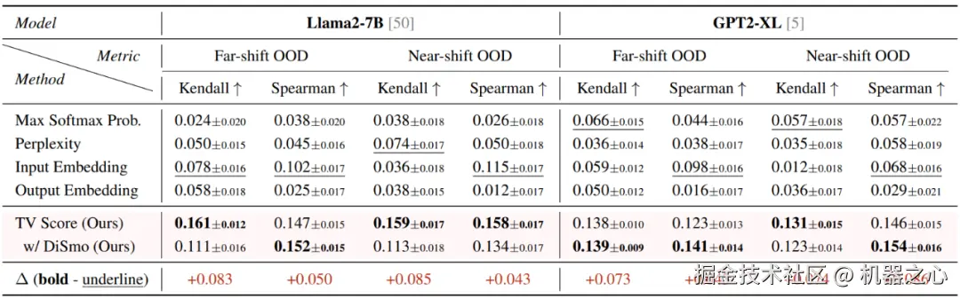 任务泛化:测试了 OOD 场景下的生成质量估计,使用 Kendall 和 Spearman 相关系数来计算 TV Score 和模型回答正确性之间的相关性。结果表明,TV Score 在该任务下仍然展现出了最优性能。