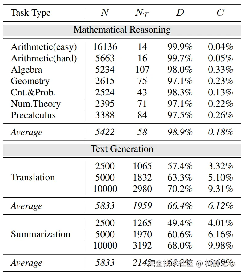 (2) 语言模型的建模是分词化的,这使得在数学意义上差别很大的表达式在经过分词操作后,共享大量的 token(数字 0-9 和有限的操作符)。研究团队量化了这一观察,其中表示出现的所有 token 数,表示出现过的 token 种类, 表示 token 重复率,表示 token 种类在词表中的占比,发现在一些简单的算术场景下,token 重复率达到了惊人的 99.9%!