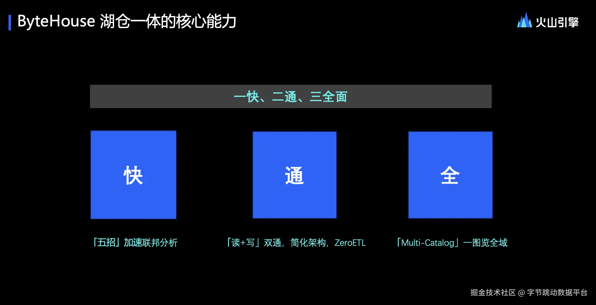 接下来,将深入介绍 ByteHouse 在湖仓一体化方面的核心能力——快、通、全。