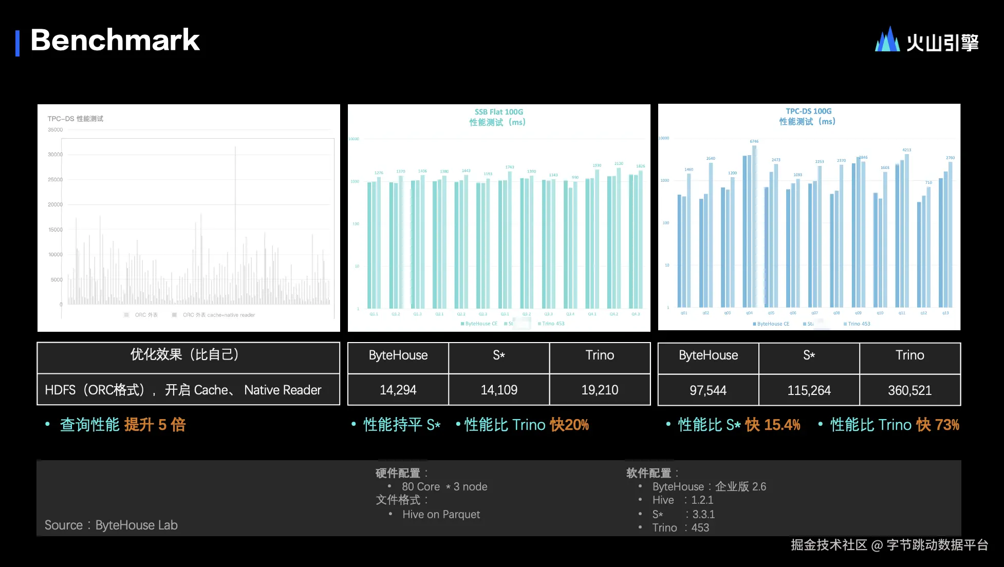 首先,第一个 Benchmark 是自己与自己对比的测试场景。在这个场景中,ByteHouse TPC-DS 所有数据都以 ORC 格式存储在 HDFS 分布式文件系统中。在此基础上,我们启用了之前提到的 Cache 能力和第一个 native reader 能力。开启这两个功能后,性能优化效果显著,直接提升了五倍。