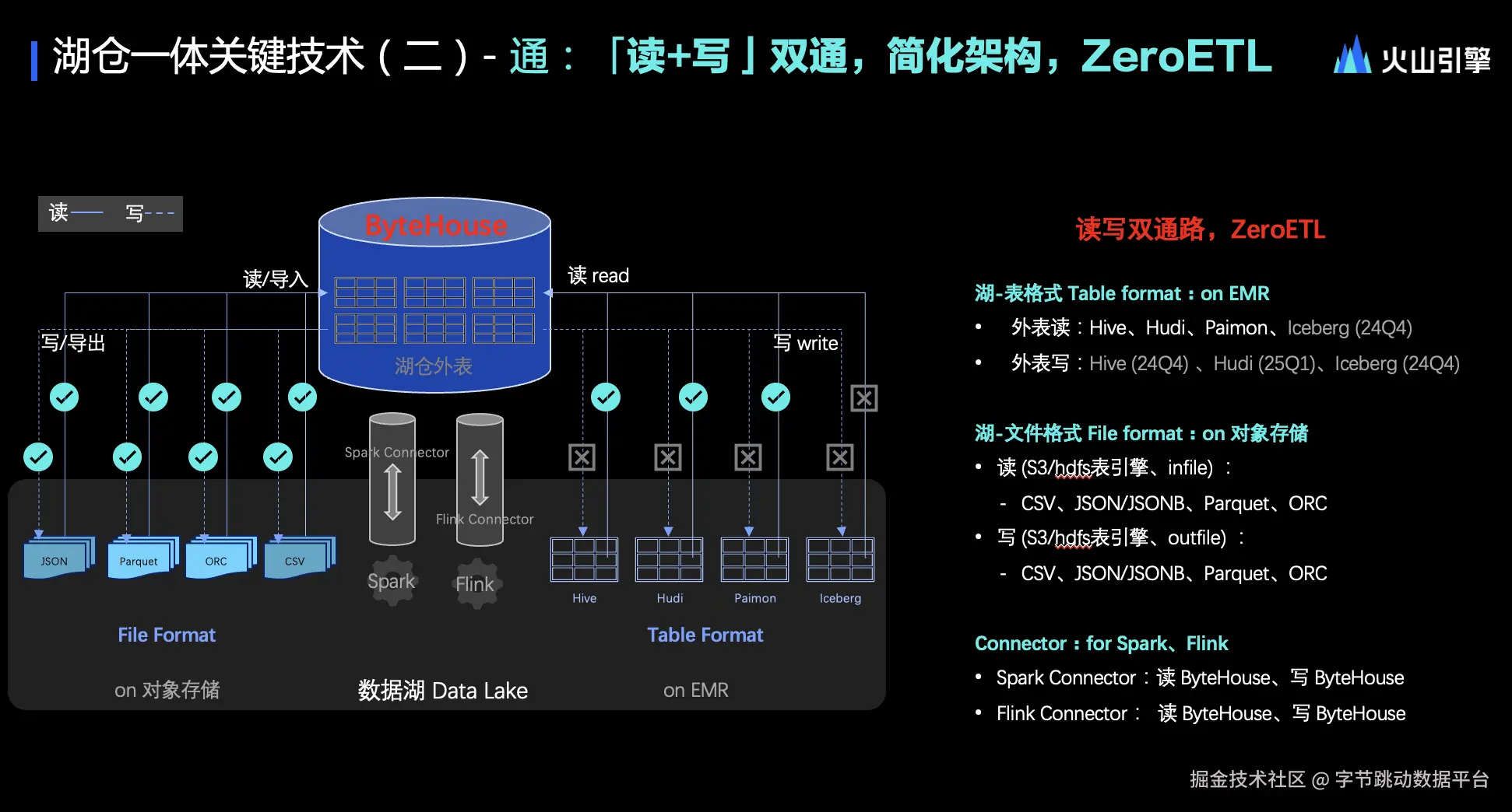 下面探讨第二个关键技术——“通”,这不仅仅是读取能力,更包括了写入能力,即双向的互操作性。这样的设计能够极大地简化数据湖与数据仓库之间的架构,甚至有可能完全规避复杂的 ETL 过程,从而实现 Zero ETL 理念的落地。