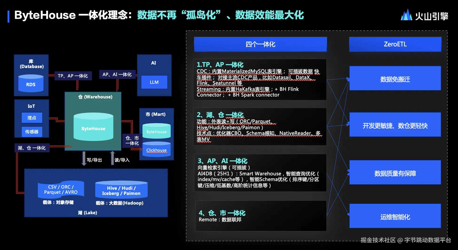 那么,我们如何应对这些挑战呢?除了性能层面、架构层面的提升,本次分享将聚焦于一体化这一主题,探讨 ByteHouse 在这一方面做出的努力。