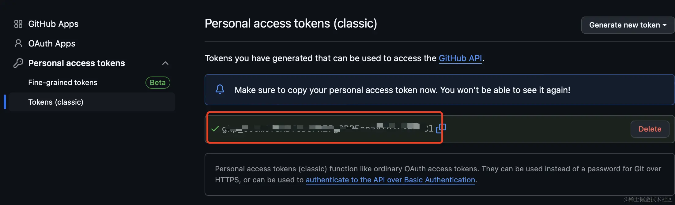先登录你的github账号,然后点击链接获取:github.com/settings/to…,或者到 Settings > Developer Settings 下面获取:
