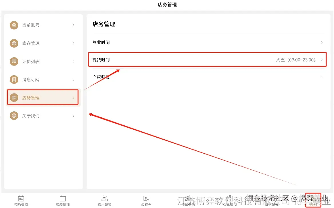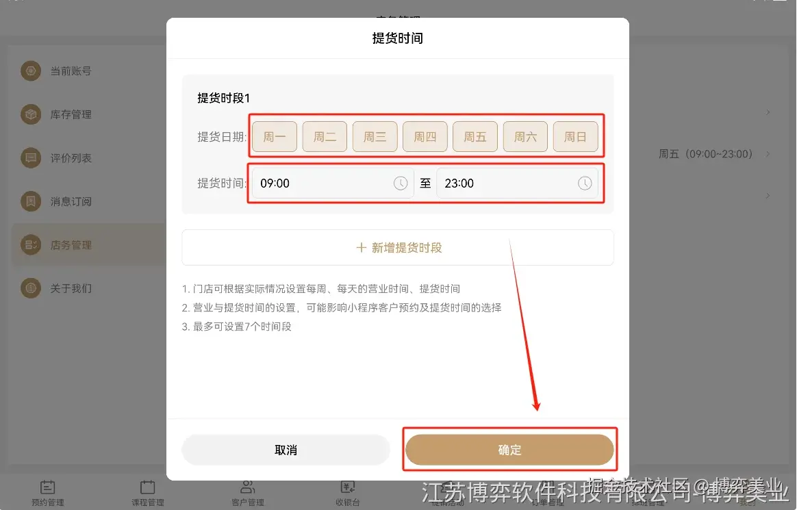 连锁美业管理系统中如何设置门店仓库自提时间?博弈美业SaaS系统收银系统Java源码私 博弈美业 2024-12-02 127 阅读1分钟 ▶ 门店仓库自提时间,是当客户在【小程序】上购买实物商品时,预约上门提货的时间。 ▶ 门店仓库自提时间,需要由各门店(店主、店长、店员)在PAD上进行设置 操作路径:【我的】-【店务管理】-【提供时间】 • 第一步: 进入【我的】页面,点击左侧栏“店务管理”,点击右边的“提货时间”栏 • 第二步: 在打开的“提货时间”窗口中,点击设置提货日期、提货时间,然后点击下面的“确定”按钮,即可设置完成 注:如需要设置不同时间段,可以点击“新增提货时段”添加。如:周一到周五,周六周日分开设置