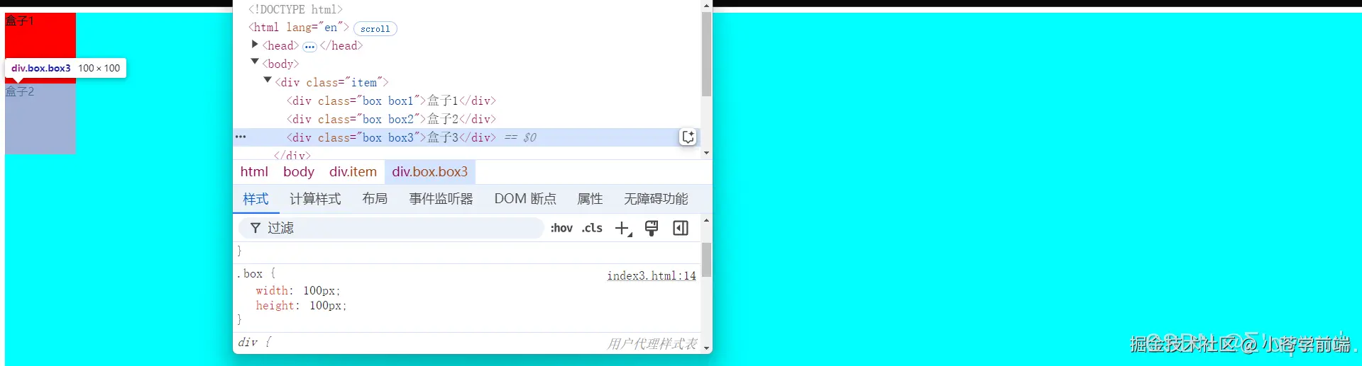 观察代码可以看到,我们bxo2的div标签(块元素)换成了span标签(行内元素)