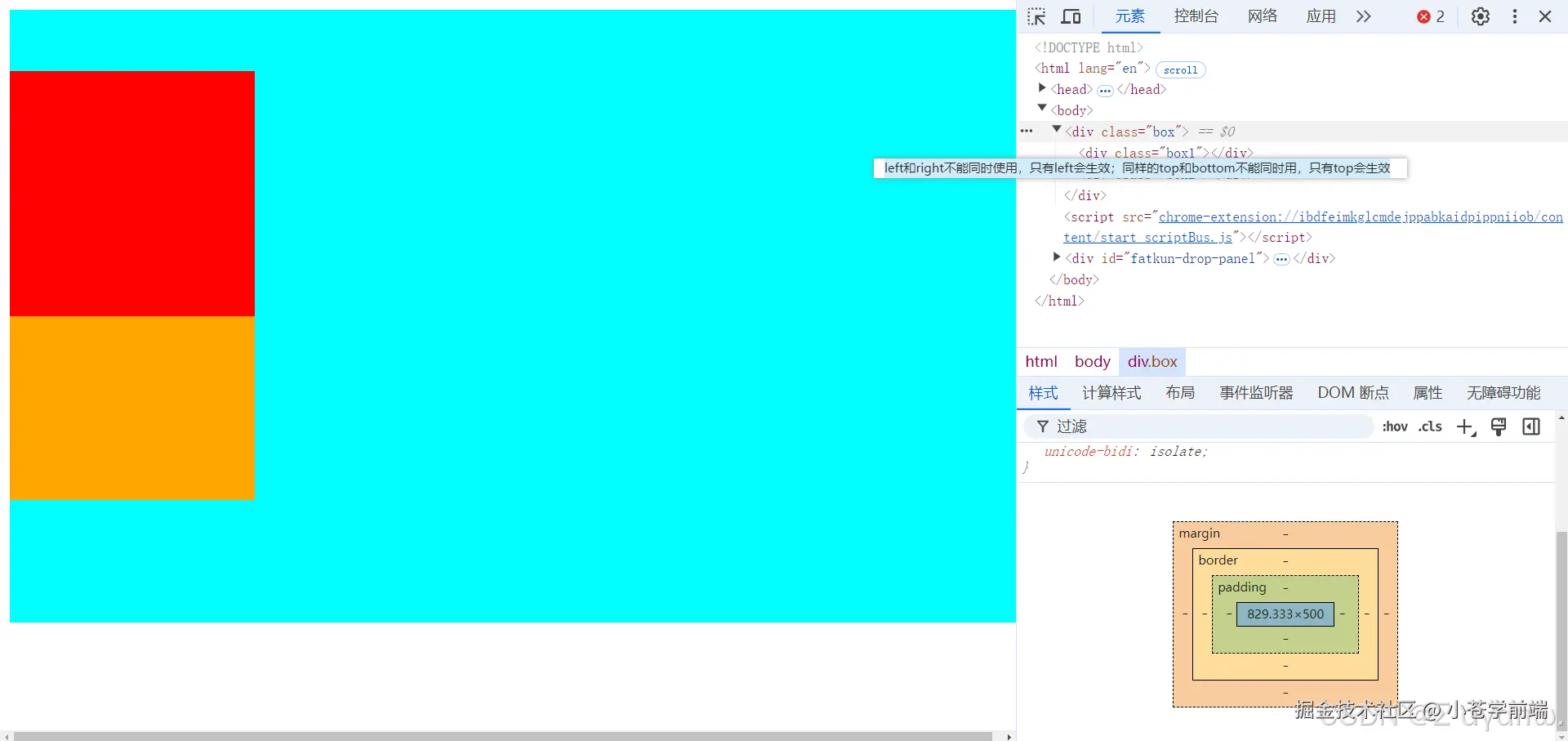 同样,在使用绝对定位时,top和bottom不能同时使用,只有top会生效,同样的left和right不能同时使用,只有left会生效