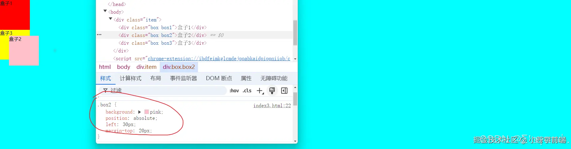 从上图中可以看到,.我们通过绝对定位添加了向左距离30px的位移,只用我们又添加了距离上面20px位置的外边距,从图片中可以观察dao粉色盒子的位置。
