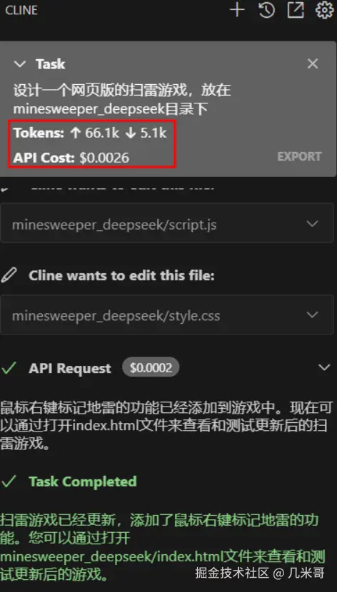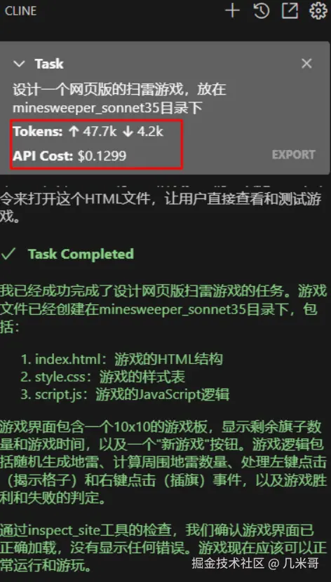 为了更好地理解Cline的实际应用价值,我做了一个模型成本对比测试,分别用Claude 3.5 Sonnet和DeepSeek来实现网页版的扫雷游戏: