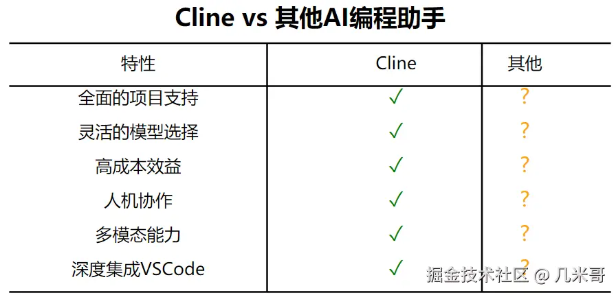 虽然市场上已有多种AI编程助手,但Cline在以下几个方面表现出独特的优势:
