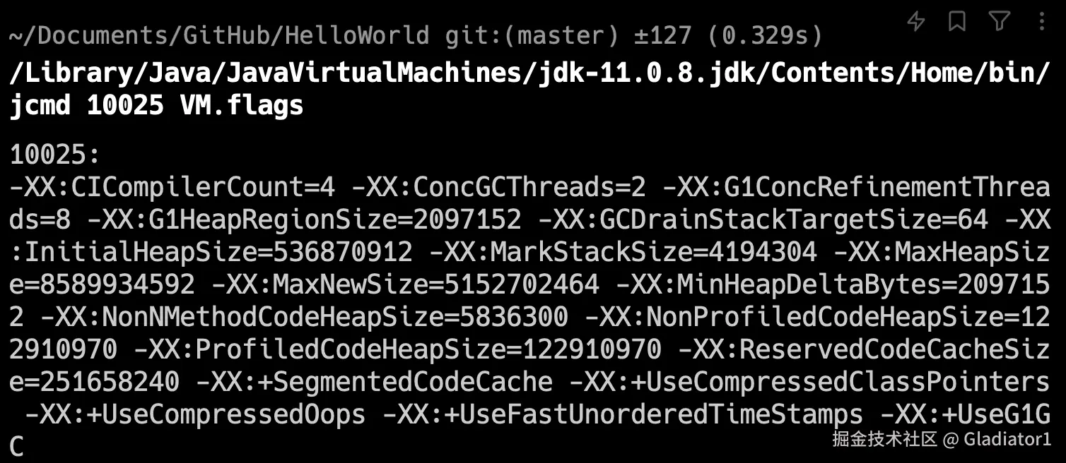 例如,使用 jcmd 10025 VM.flags 查看进程 10025 的 JVM 参数,相当于 jinfo -flags 10025: