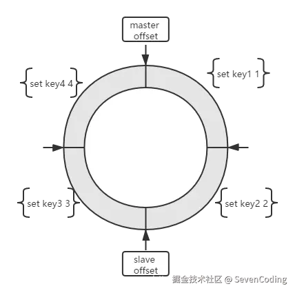 - 主服务器按照顺时针方向写命令,主服务器最新写入的位置即为上文提到的主服务器的偏移量,这里叫master offset。