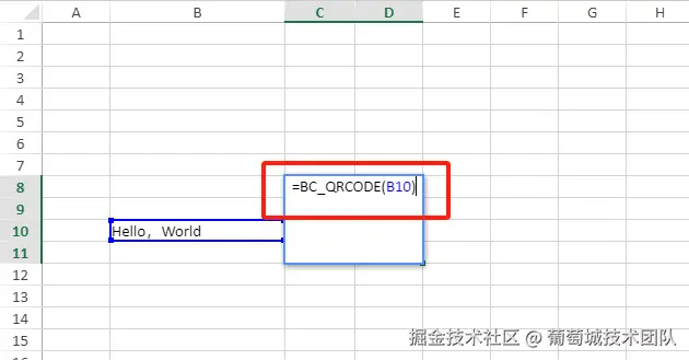 上述代码是为A1单元格创建一个公式,公式是=BC_QRCODE("hello,我是二维码"),结果是这样子的: