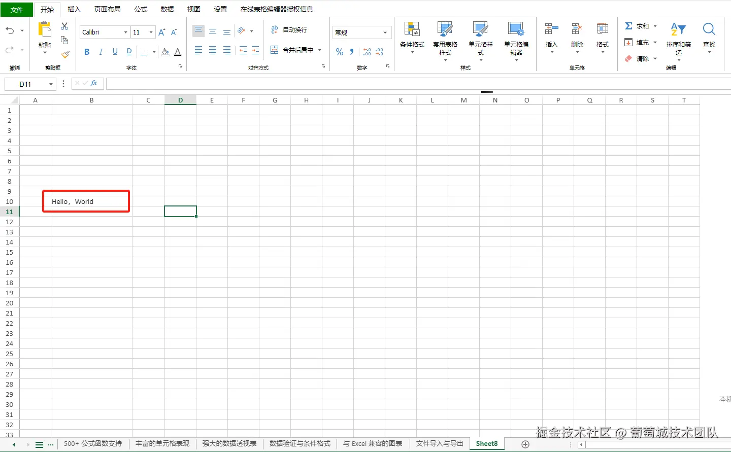 然后我们随便找一个空白的单元格,输入以下公式,空格中输入显示信息的单元格位置(比如上图中的“Hello World”的位置B10)