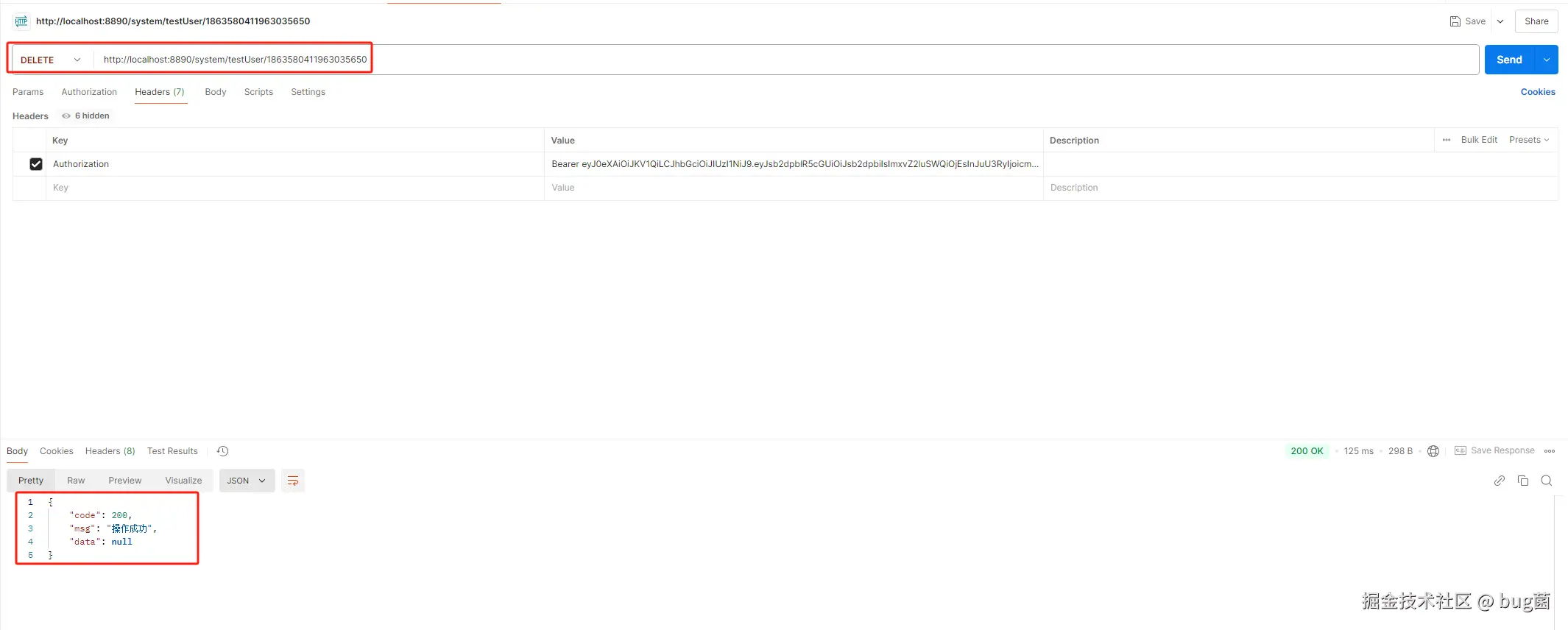 接着我们将其ID进行入参删除。通过Postman进行调用接口,可以看到接口调用成功。