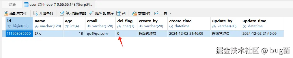 接着我们查验下数据库其逻辑删除字段,可以看到,自动将其改成了2。