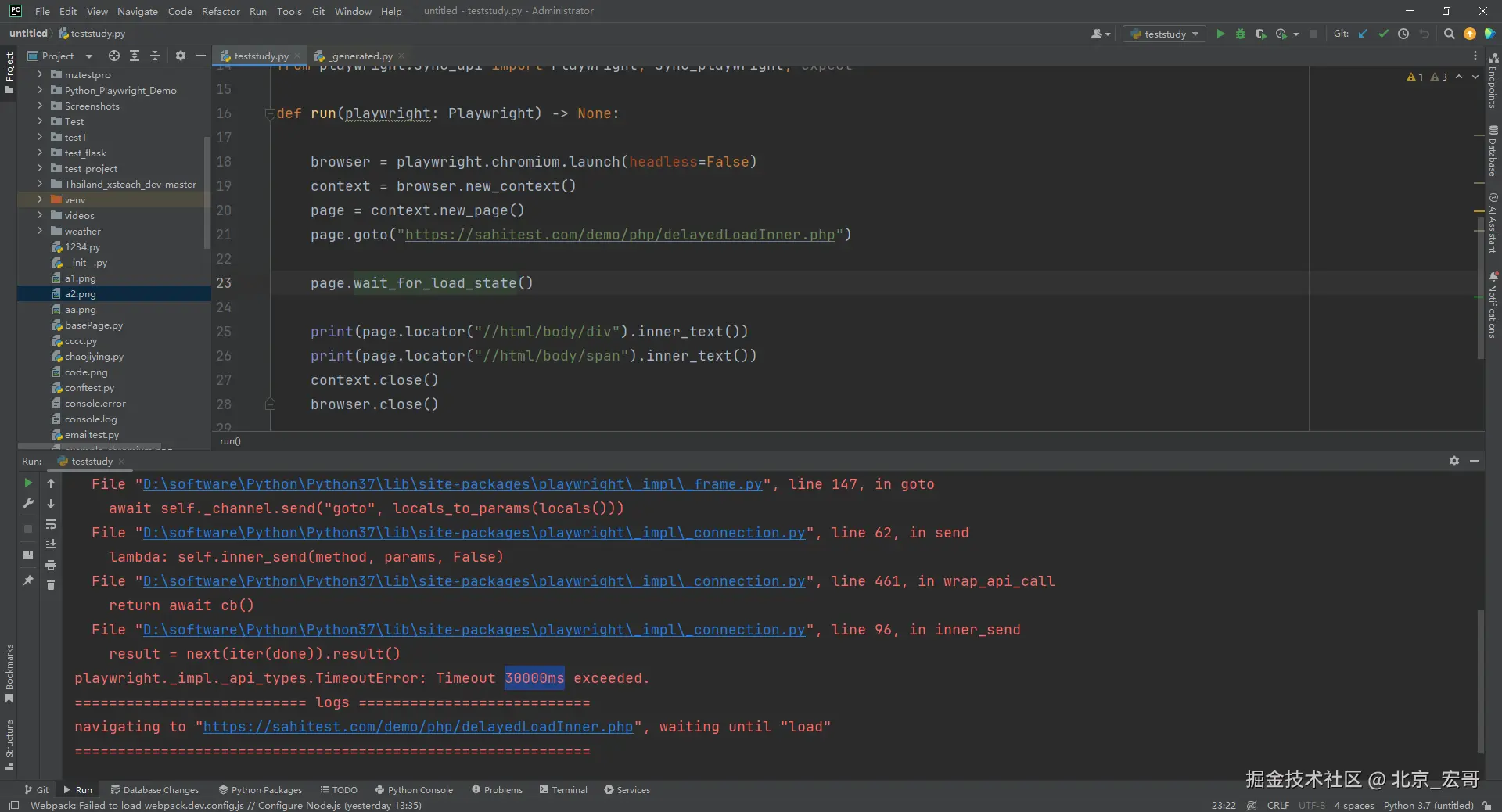 1.运行代码,右键Run'Test',就可以看到控制台输出(.运行代码控制台报错,因为加载这个页面需要40s,而此方法默认30000ms=30s,超时报错),如下图所示: