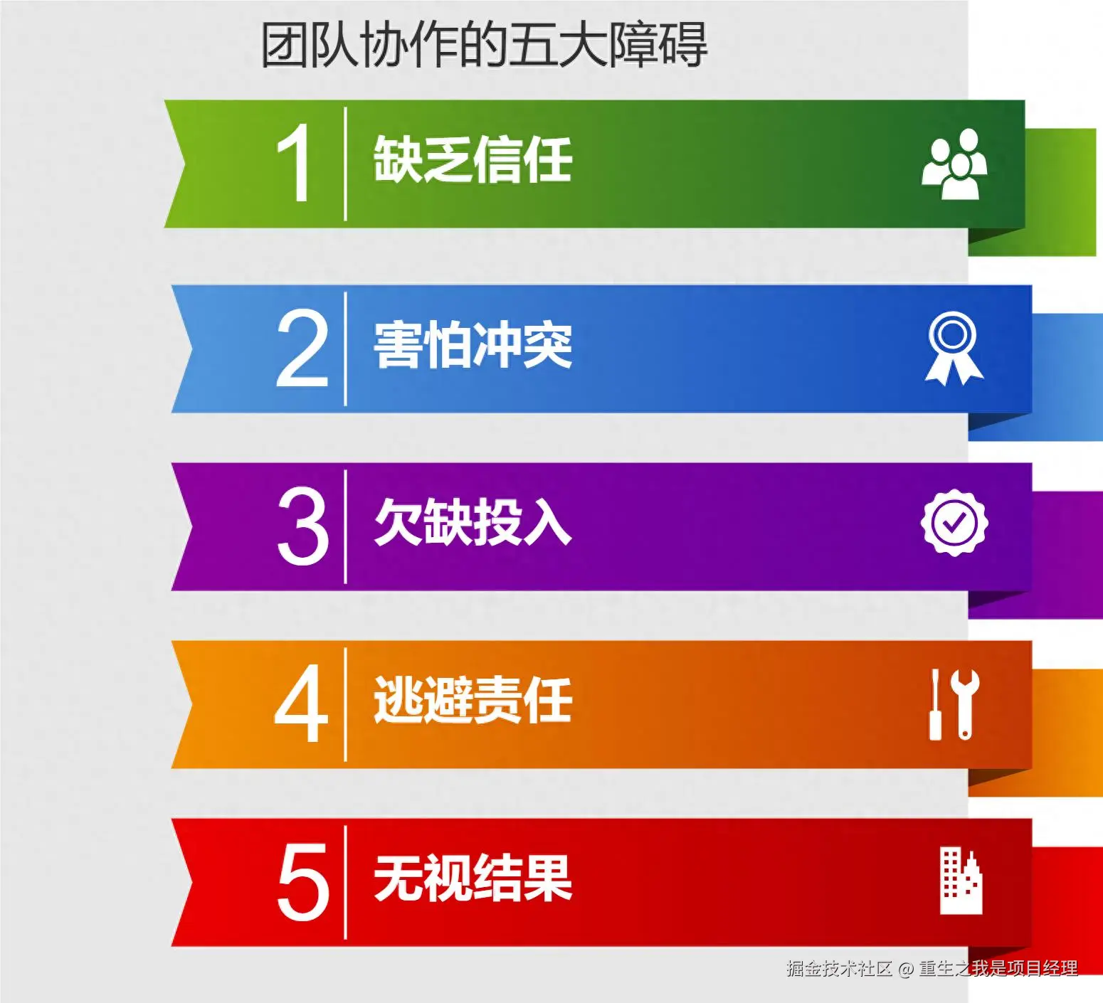 团队协作中的五大障碍——缺乏信任、害怕冲突、欠缺投入、逃避责任和无视结果,往往会影响团队的整体效率。通过采取开放的沟通、明确的目标和角色、解决冲突的能力、灵活的思维和行动,以及建立互信和合作的关系来克服这些障碍,团队将能够实现更高水平的协作。
