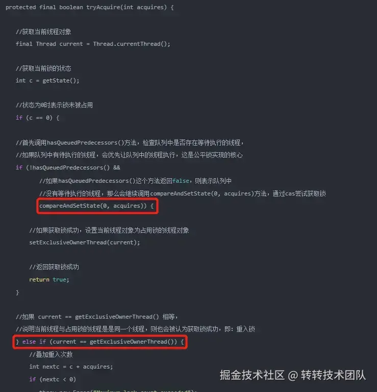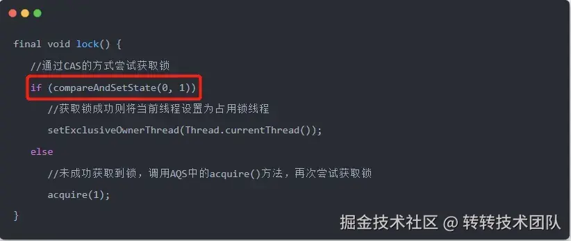 通过下面的代码对比我们可以看到FairSync.lock()方法实现是直接调用了AQS提供的acquire()方法。而NonfairSync.lock()方法实现是先通过CAS的方式先尝试获取了一次锁,如果尝试成功则直接将当前线程设置为占用锁线程,而获取失败时同样调用了AQS提供的acquire()方法。从这里可以看到非公平锁获取锁时,如果当前锁未被其他任何线程占用时,当前线程是有一次机会直接获取到锁的,而从公平锁的方法实现中我们还无法看到公平锁是如何实现,那我们继续深入看下AQS提供的acquire()方法的实现。