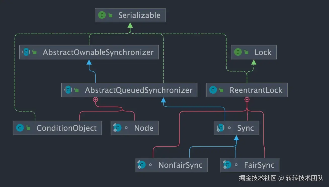 通过继承关系图谱,我们可以看到ReentrantLock类实现了Serializable接口和Lock接口,另外其内部定义了3个内部类Sync、NonfairSync、FairSync。Sycn是一个抽象类实现了AbstractQueuedSynchronizer(下文简称AQS),NonfairSync、FairSync为Sync的实现子类,通过类的命名其实我们就可以知道NonfairSync为非公平锁的实现类,FairSync为公平锁的实现类,而Sycn为抽象出来的公共抽象类。