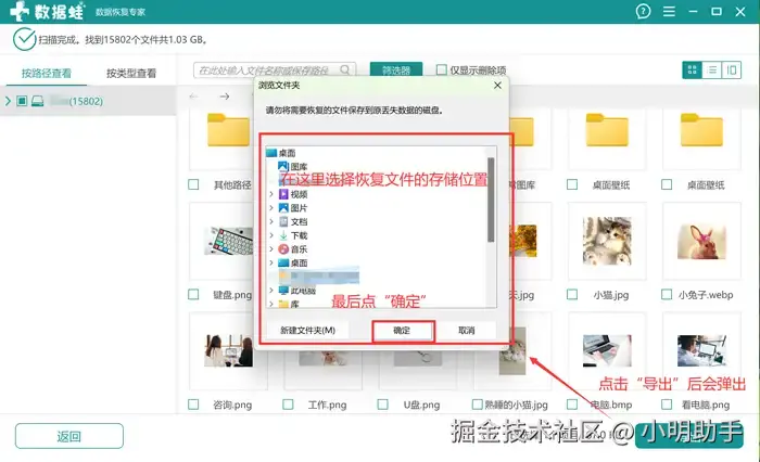 步骤3: 点击完“导出”后,选择自己恢复文件的存储位置,完成整个数据恢复的流程。