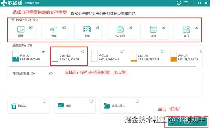 步骤1: 打开数据 蛙恢复专家这款软件,然后选择需要恢复的文件类型和扫描位置(即D盘),最后操作软件开始扫描;