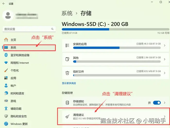 打开电脑的“设置”页面,按顺序点击“系统”和“存储”,就能够看见“清理建议”选项。点击进去后,在里面选择需要进行清理的磁盘(即D盘)就能使用该功能了。