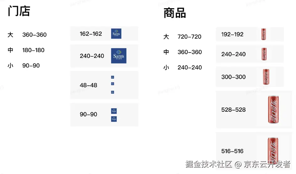 图片资源尺寸过大,会导致图片下载缓慢,资源位白屏,用户体验差。以往网管在进行商品图片下发的时候,无论是店带品楼层的商品还是商品详情页展示的商品大图,采用的都是同一套尺寸较大的图片,这就导致在店带品楼层商品列表过多时,图片下载过程等待时间过长。经过与后端团队,产品和UED团队积极沟通,确定了一套3尺寸图片方案: