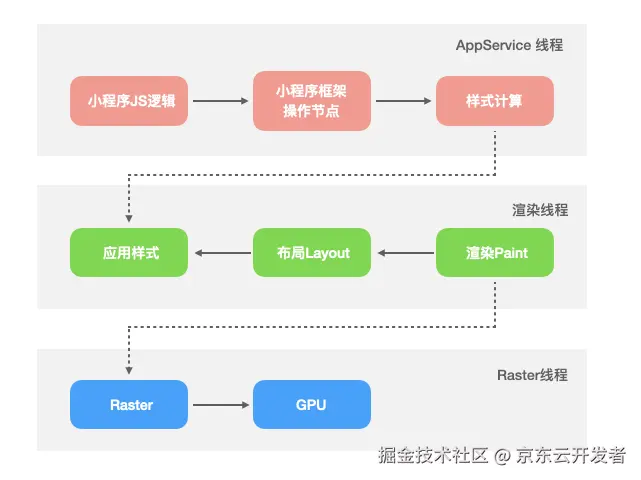 Skyline 创建了一条渲染线程来负责渲染任务,并在 AppService 中划出一个独立的上下文,来运行之前 WebView 承担的 JS 逻辑、DOM 树创建等逻辑。