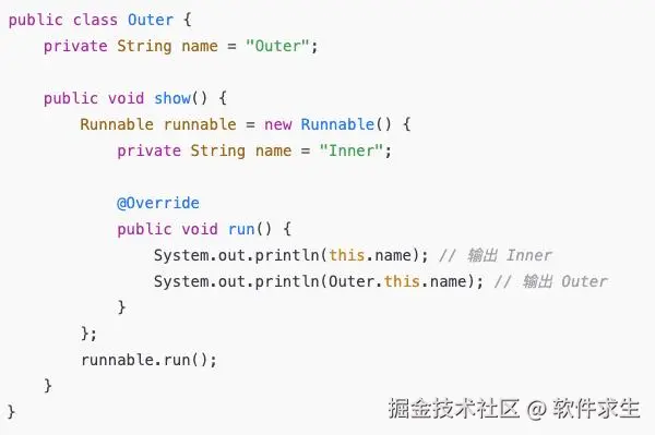 匿名内部类中,this 指的是匿名类实例,而不是外部类实例。如果需要引用外部类,可以用 外部类名.this 的方式。
